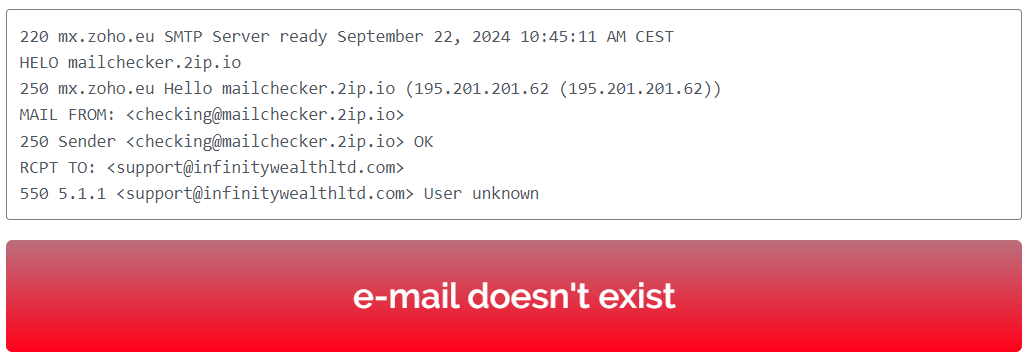 These are far from the only shortcomings. We decided to check the email address listed for Infinity Wealth LTD and discovered that it was fake. In other words, there’s no point in writing to it — you won’t get a reply. Something tells us that the phone number is also fake.