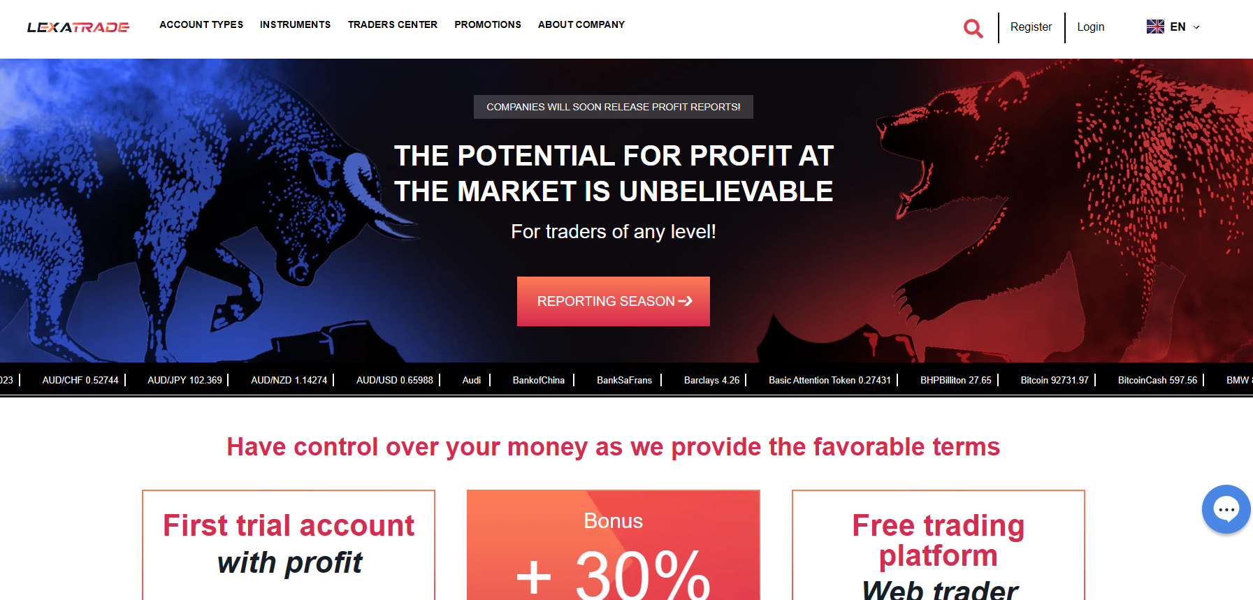 Outwardly, the official LexaTrade website resembles many other offshore brokerage companies: pseudo-motivational phrases, large blocks advertising a 30% deposit bonus, clichéd bulls and bears, and so-called advantages.