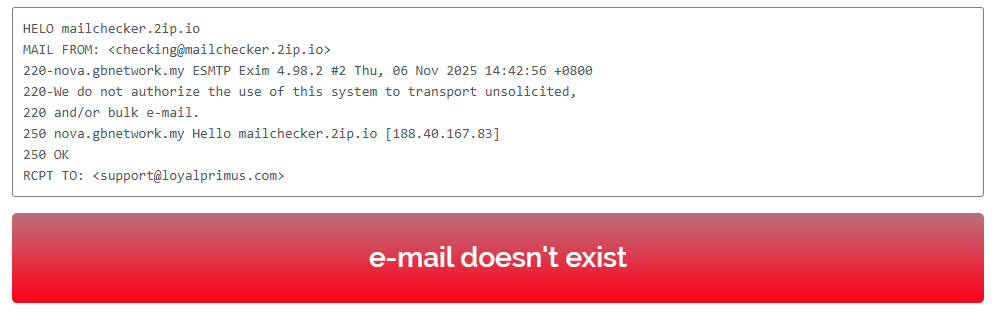 An even more significant red flag is the fake email address. There is no point in writing to the email listed in the “Contact” section because it simply doesn’t exist. Loyal Primus literally asks clients to contact a nonexistent address.