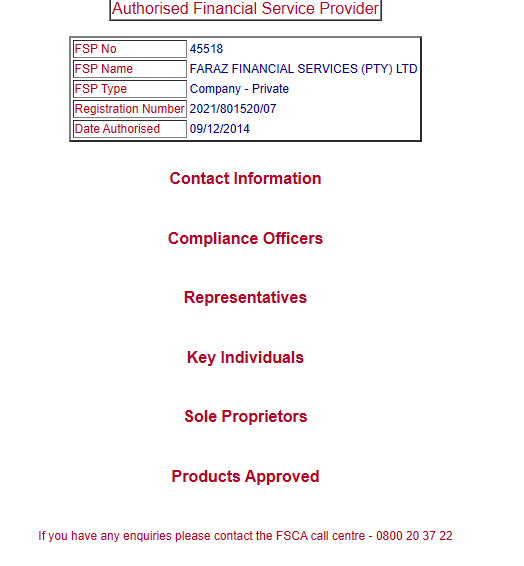 The legal entity, Faraz Financial Services, received an FSCA license in 2021. This is confirmed through the official regulator’s registry. The brand was previously known as Investico. According to WebArchive snapshots, the platform has indeed been operating since 2021, as the domain was listed for sale before that.