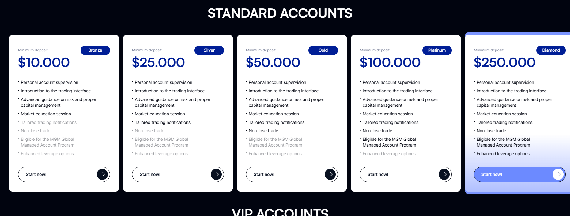 Several features appear purely decorative. Terms like non-lose trade, tailored notifications, and market education sessions are not supported by any technical explanation, especially non-lose trade. It is impossible in real markets. So, these features are rather dubious. The same goes for the mysterious MGM Global Managed Account Program, which is mentioned in every plan, but nowhere explained or documented.