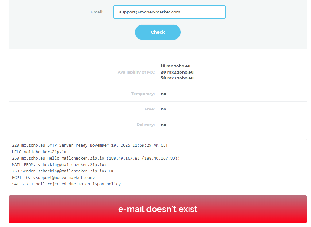 The contact information on the Monex Markets website exists purely to create the illusion of a “real office”. The site lists an address in London, a phone number with the UK code +44, and an email address. Verification shows that the email is fake — it doesn’t exist.