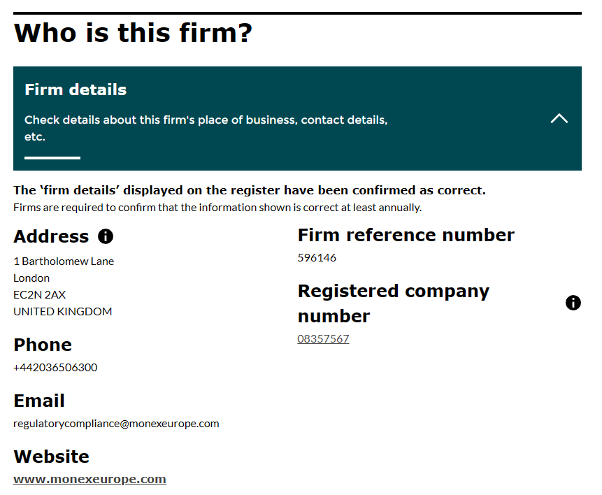 In the official FCA (Financial Conduct Authority) register, there really is a company with a similar name — Monex Europe Markets Limited, registered in London with license number 596146. This is a legitimate, active organization legally authorized to provide financial services in the UK. However, it has absolutely no connection to the website monex-market.com. Our so-called “broker” simply stole the name of a real company to appear legitimate and deceive clients.