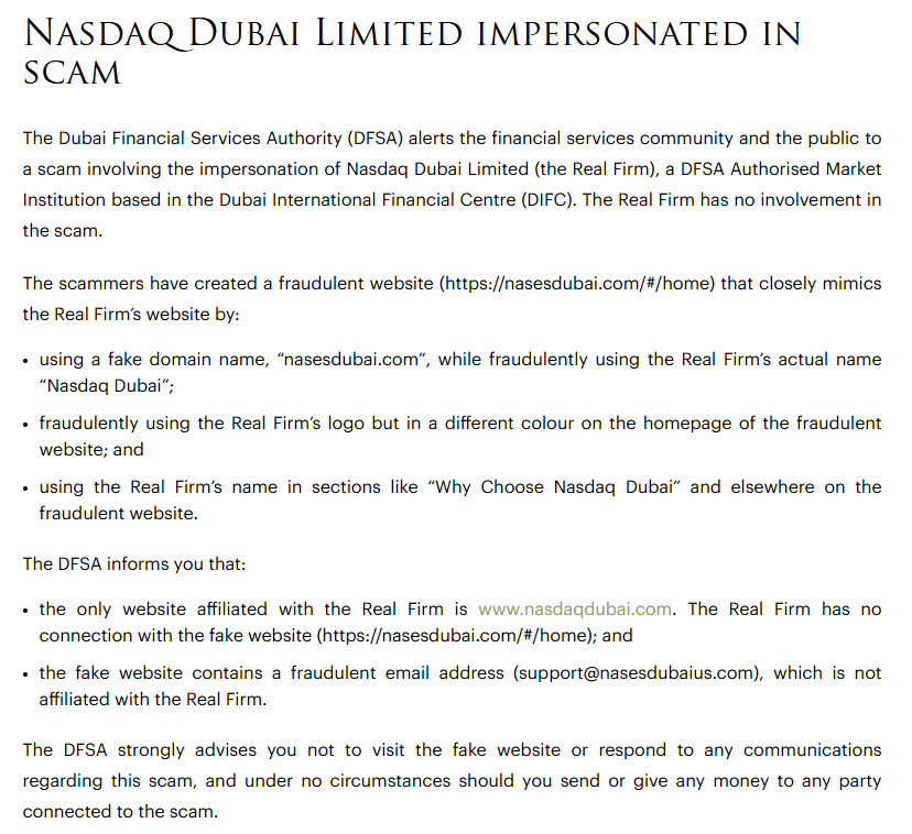 Everything you see with Nasesdubai.com is a scam and a fake. The DFSA regulator has already warned about this. In reality, this “broker” is a counterfeit that tries to use the name of the legitimate Nasdaq Dubai company, creating the illusion of reliability and licensing. The scammers are using fake domains and logos similar to the official brand, but this is far from a real company.