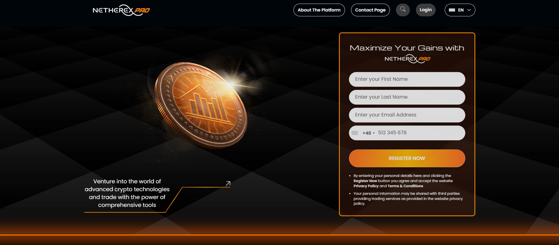 As soon as you visit the NetherexPro website, it becomes immediately clear that it was thrown together in a rush. A black background, neon-orange accents, and cheap 3D images of coins and candlesticks. The visuals are clearly pulled from the internet — the first ones they could find. The company did not even bother to create original graphics.