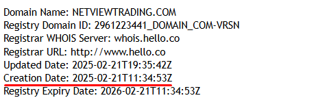 It is even possible to check the domain registration date for netviewtrading.com to estimate when this platform was launched. The domain was purchased on February 21, 2025 — just a month ago. How could an online broker have been serving traders for 34 years without a website? Some real miracles at play here.