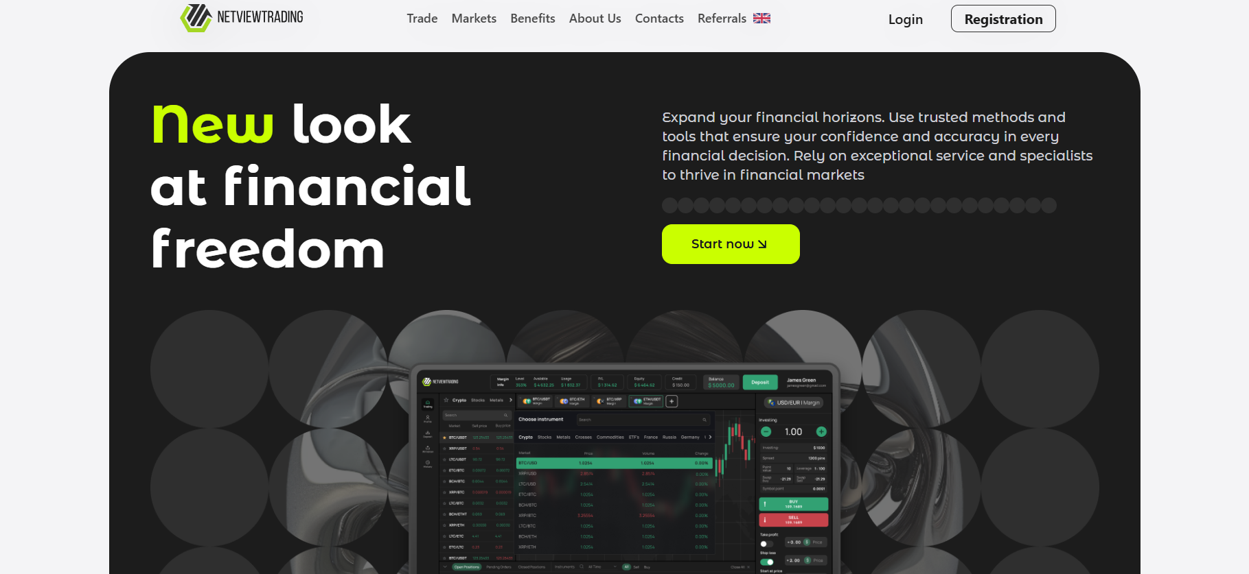 As usual, we will start by reviewing the official website of NETVIEW TRADING COMPANY. The broker did not put much effort into the design or uniqueness of its platform. The firm used a dull, pre-made template to avoid spending too much time and resources: a standard header with main sections, generic elements that have been seen on other companies’ websites, and a complete lack of real proof for the claims it makes.