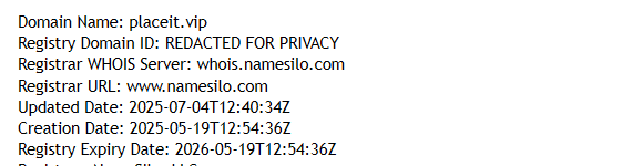 It is also worth noting the claimed period of operation — 15 years in the market. This is a blatant lie. A check showed that the domain placeit.vip was registered in May 2025, which means the project is only a few months old. There is no long history, and there never could be.