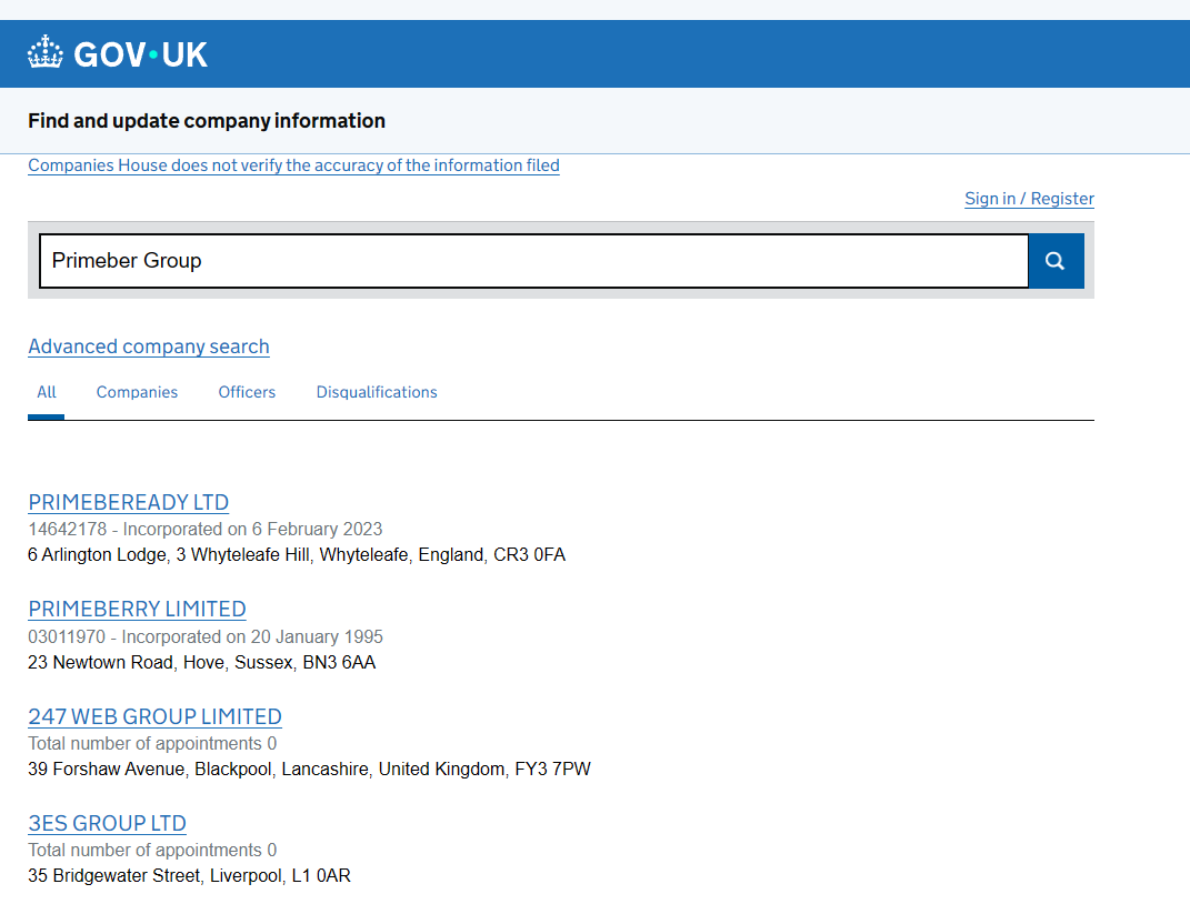 Next — the legal address. The footer lists a headquarters in London. However, that’s also fake. Neither the Companies House database nor any open commercial registries show an organization named Primeber Group. On the GOV.UK site, there’s no record of such a firm, which means no official company by that name exists in the United Kingdom at all.