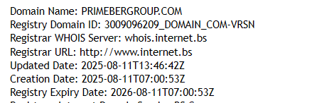 And finally, the operational history. The website claims that the company has been in business for “a year”, but domain data tells a different story. According to WHOIS, the domain primebergroup.com was created on August 11, 2025. In other words, the project is not even a few months old. All the talk about “a year of development”, “a team of professionals”, and “transforming investments” is pure fiction. This is a typical newly created fraud site disguised as an “international broker”.