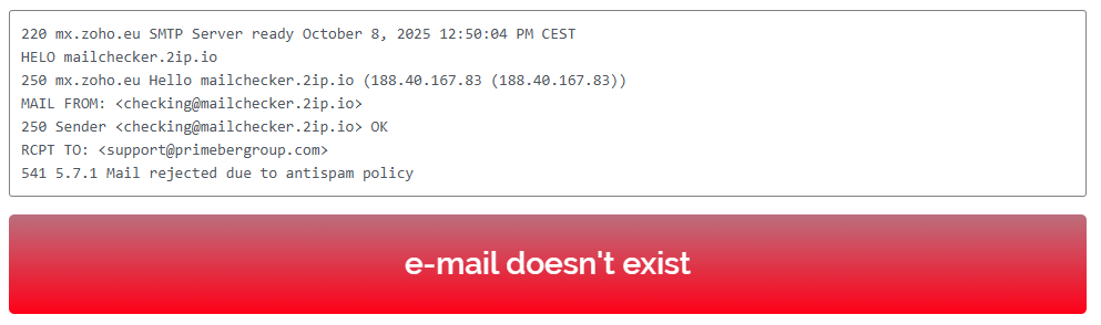 Verification showed that support@primebergroup.com is a nonexistent address. Emails sent to it are undeliverable. This means that the “support service” is fake, just like the listed UK phone numbers. There’s no real way to contact the broker, and anyone who tries will simply waste their time.