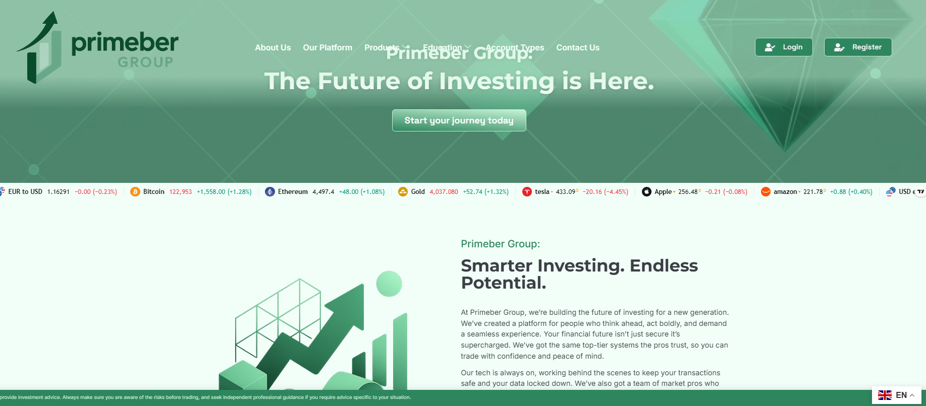 Let’s start with the official Primeber Group website. The homepage is designed in generic green tones, featuring cliché 3D icons and template animations of arrows pointing upward, as if capital growth were guaranteed by default. The images have nothing to do with actual trading — there are no terminals, charts, or platform interfaces. Everything relies on generic stock visuals and marketing slogans like “Smarter Investing. Endless Potential” and “The Future of Investing is Here”.