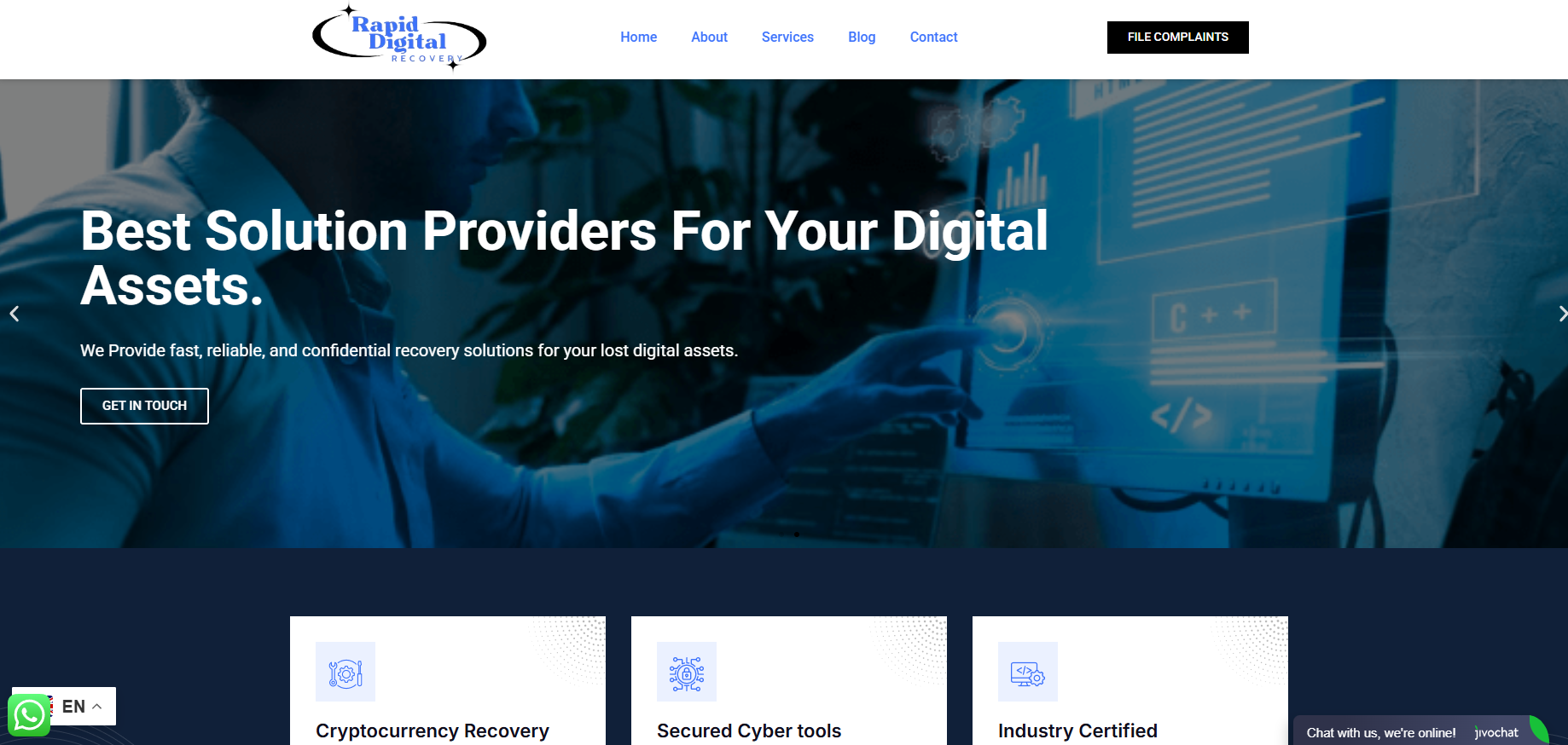 The content is a whole other story. It feels like it was written by an intern who had just copied pretentious phrases from the internet. They promise to recover any stolen money, restore hacked wallets, and “protect your assets”. How exactly? No answer. Rapid Digital Recovery tries to lure in clients with fancy words and false promises.