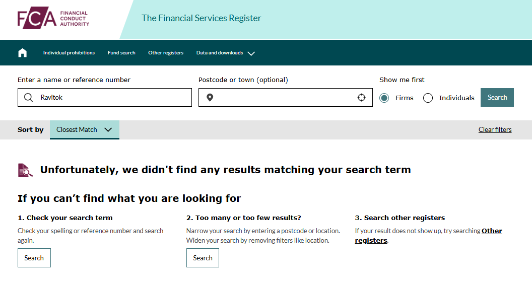 Furthermore, there is no such organization registered in the UK. Ravitok is simply absent from the country’s Companies House register. This means the provided legal address is fake.