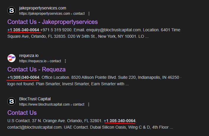 A simple Google search of the phone number also revealed interesting things. It turns out that the phone number +1(305)340-0064 is listed not only for this company but also for two others. Moreover, these are also investment firms supposedly based in the USA.