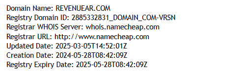 Moreover, the company was launched very recently. There is no founding date listed on the website, but this can be verified through the domain. Their official domain, revenuear.com, was registered in 2024. However, it remained inactive until 2025, when it was recently acquired by the creators of this fraudulent platform.