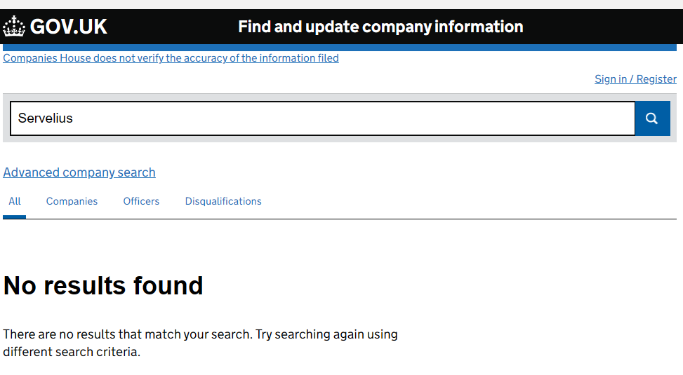 The broker claims to be headquartered in the United Kingdom. That alone raises a major concern, because all financial companies operating in the UK are required to have a license from the Financial Conduct Authority (FCA). Servelius does not hold an FCA license because in reality, this company does not exist. We checked the Companies House register, and there is no such legal entity listed.
