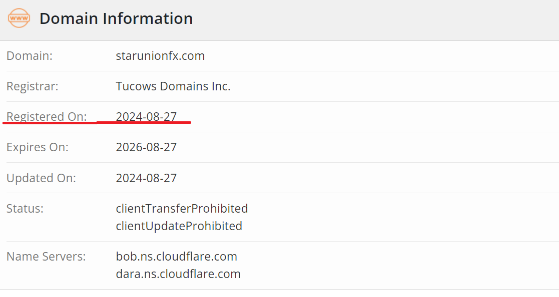 As we can see, whois data shows that the domain starunionfx.com was registered in August 2024. This means the broker is less than two months old. So, the claims about receiving awards over four years ago are fake. As is the statistic of having 1,000,000+ clients, which would be physically impossible for a broker no one has heard of within a month and a half.