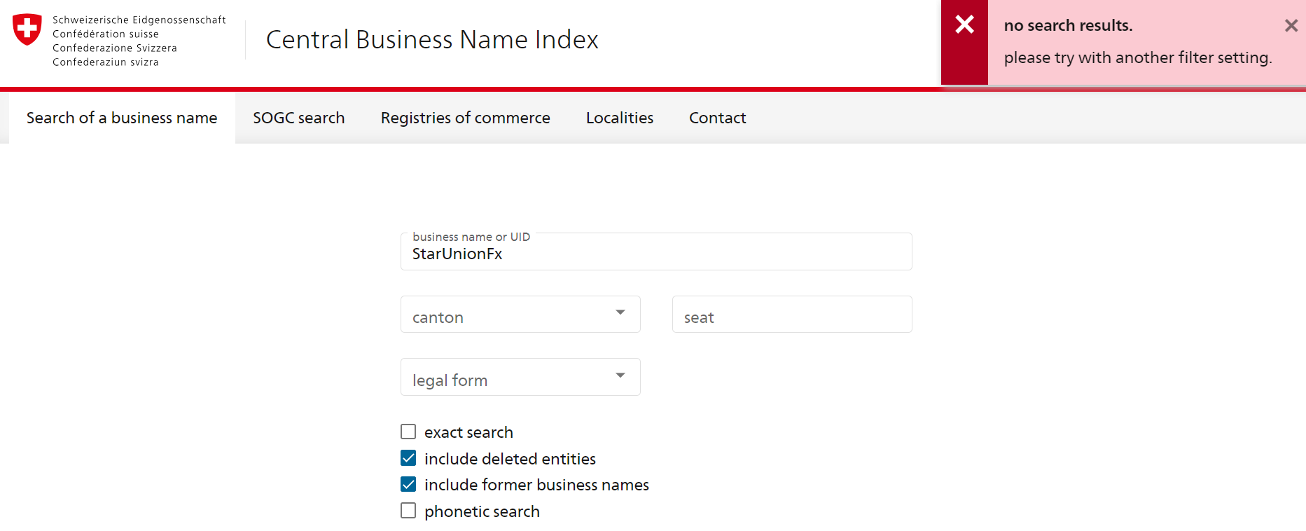 StarUnionFx - not in Swiss registry