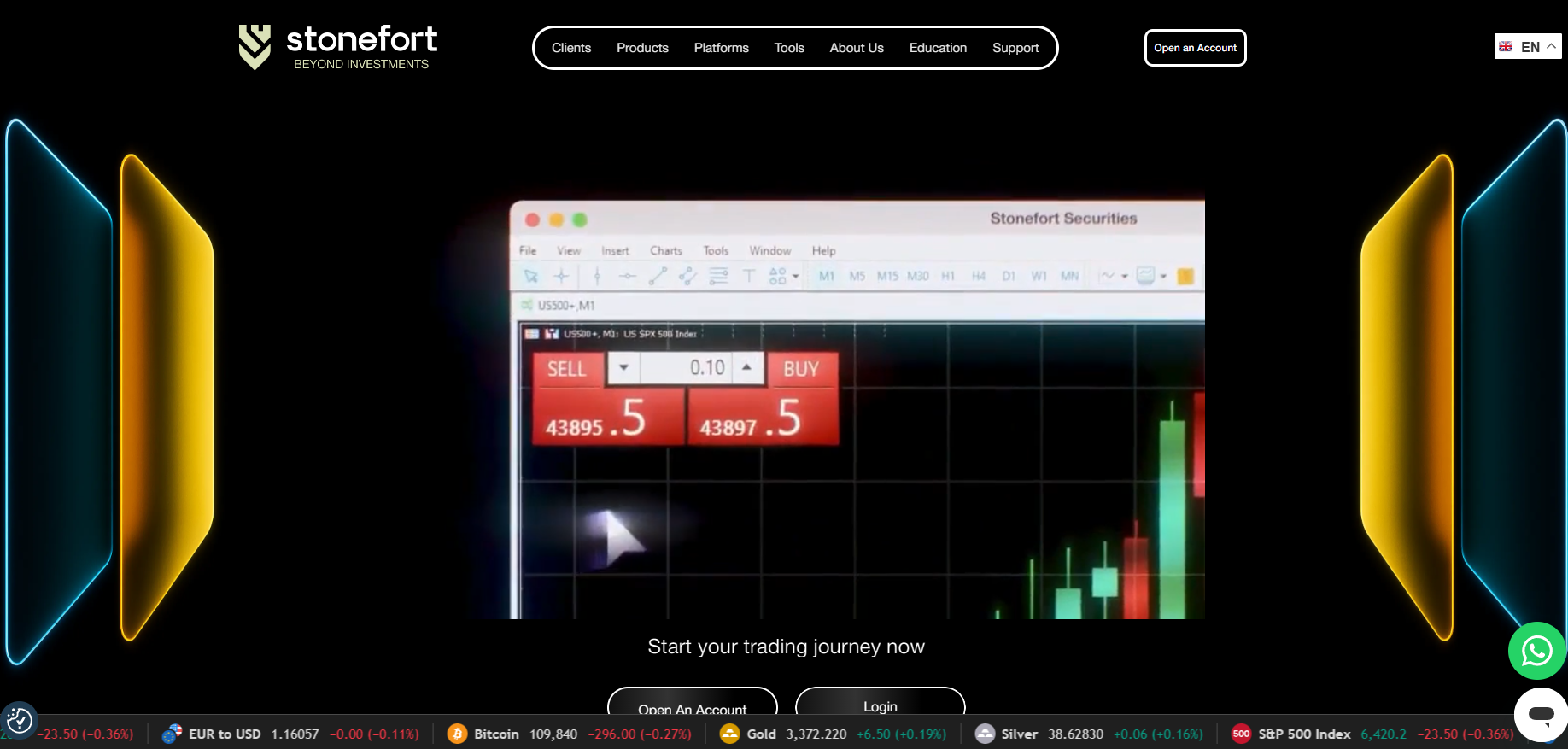 The official website of Stonefort Securities looks standard and does not stand out in any way. At the top of the page, there is a familiar menu with sections: Clients, Products, Platforms, Tools, About Us, Education, and Support. In the corner, there is a button to open an account and select a language.