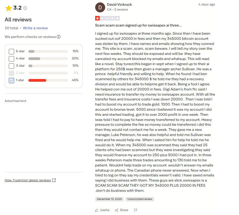 Reviews also include complaints about the inability to reach the phone numbers provided and about managers being replaced without explanation. Interestingly, SwissApex sometimes responds even to extremely negative reviews by claiming they can’t find such clients in their internal databases. Formally, this appears to be an attempt to maintain dialogue and publicly respond to criticism. But can’t they just check all their clients’ profiles on all their websites? This seems like a cheap excuse, raising additional questions and undermining trust.