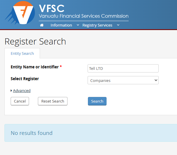Furthermore, Tellltd.com is lying about being under VFSC supervision. We checked the vfsc.vu registry and found no trace of the company in question. The legal entity Tell LTD is not listed there.