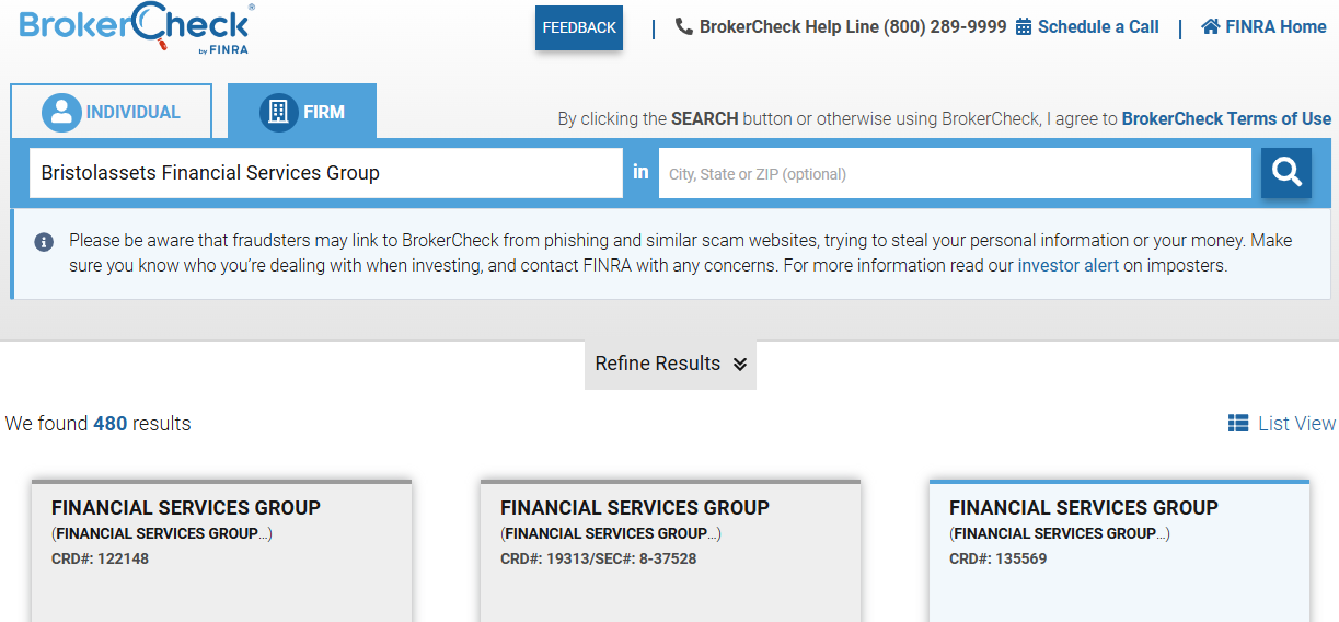 Apparently, the project representatives did not expect anyone to follow their advice. But we did check. We found 480 results in FINRA’s database, but none corresponded to the query Bristolassets.
