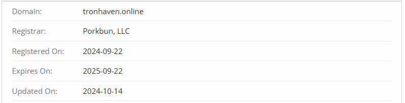 By the way, the project was launched very recently. It was started on September 22, 2024, as that’s the domain registration date for tronhaven.online — just over a month ago. The short operating period is also a signal that it’s not worth the risk.