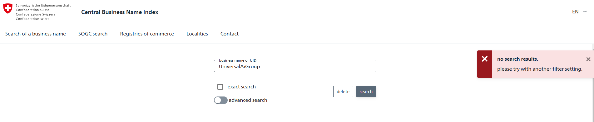 Next, we verified their legal address. We ran it through the Swiss Business Name Index (Zefix) — the official government registry of legal entities. Again, nothing. This company does not exist on the registry. The address is fake. The company simply does not exist.