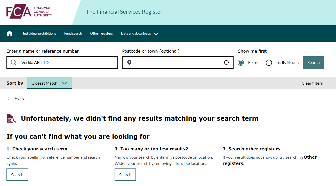 That’s exactly what Verida AFI did. On its website, it claims to be regulated by the FCA, but a check of the FCA register clearly shows: