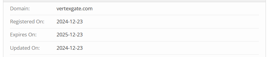 Another red flag is the short duration of the operation. The domain vertexgate.com was registered only a month and a half ago, in December 2024. This is a brand-new project that cannot be trusted. Most fraudulent companies appear on the market to quickly collect money and disappear.