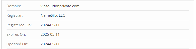 Another important issue is the period of operation, as the longer a firm has been in existence, the more trustworthy it is. However, this is not the case here. The period of operation is unknown since it is not mentioned on the website, but you can find out using the Whois service when the domain vipsolutionprivate.com was registered. As seen in the screenshot below, the domain was registered in May 2024. This broker is a very young firm without experience and a solid operating history. It has not even been around for a year.