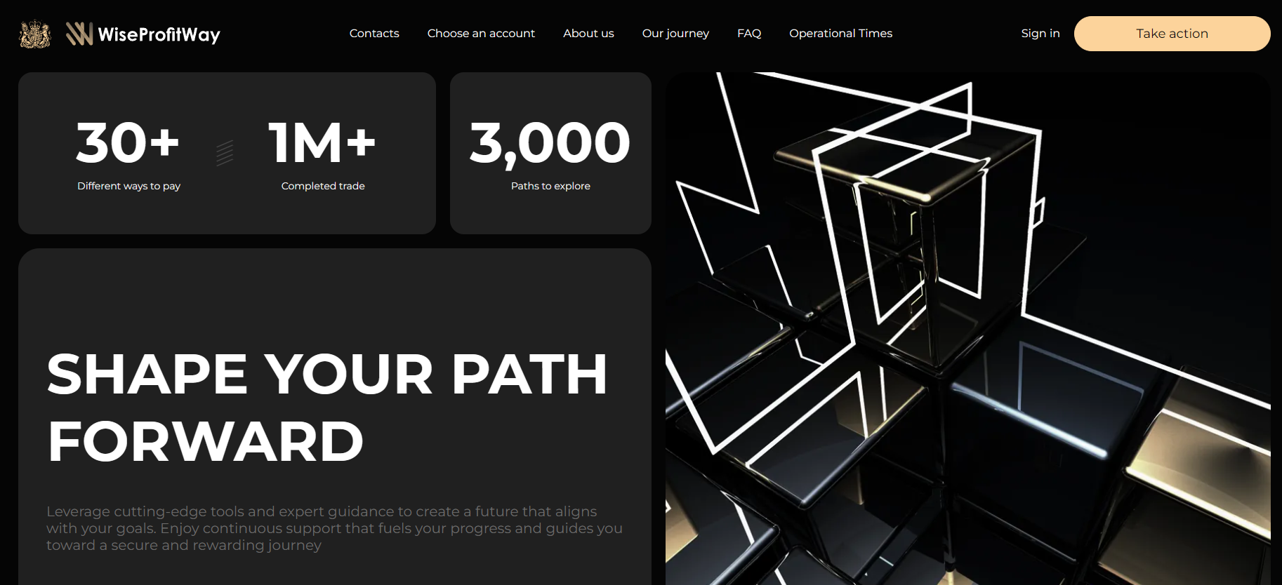 Let us start with the official WiseProfitWay website. At first glance, it might look like a serious company: a dark background, neon lines, and 3D images intended to symbolize security. All of this is designed to create an impression of solidity.
