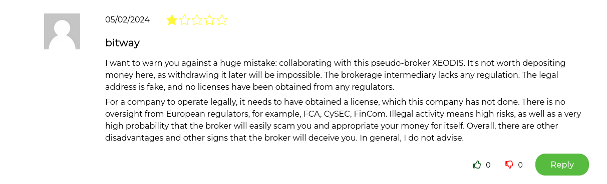 Our unequivocal conclusion regarding Xeodis is that collaboration with them poses a significant risk to both you and your finances. Their offshore registration provides a clear avenue for circumventing the law. Given their short operational history, there is a substantial risk of the company ceasing operations at any moment. We strongly advise against engaging their services.
